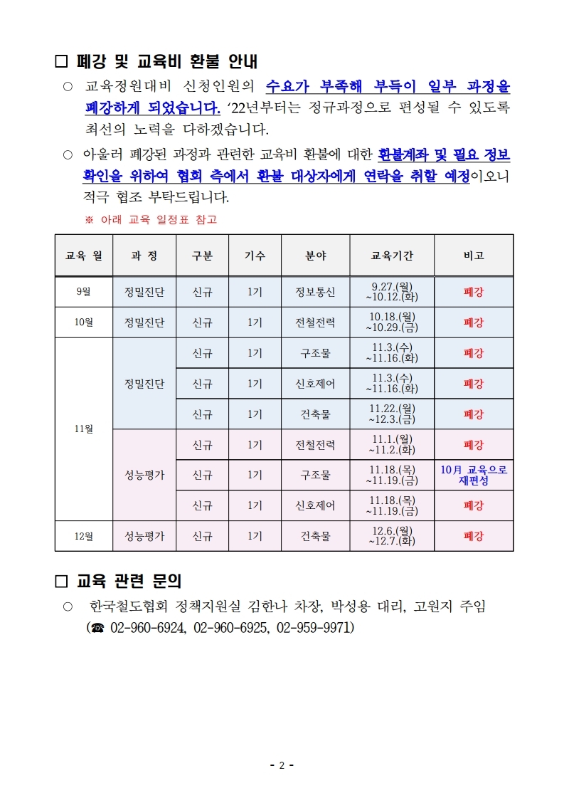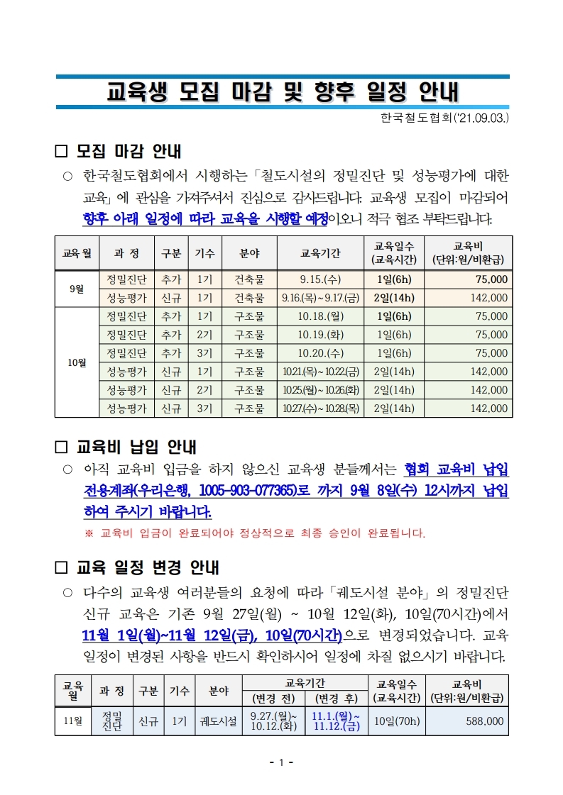 철도시설의 정밀진단 및 성능평가에 대한 교육생 모집 마감 및 향후 일정 안내
