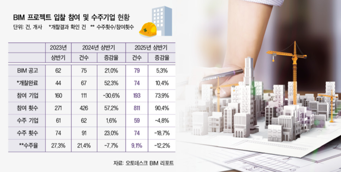 BIM 입찰 참여기업 수도 대폭 증가했다. 올해 상반기 입찰에 참여한 기업은 193개사로 전년(111개사)보다 73.9% 늘었고, 참여 횟수는 811회로 90.4% 폭증했다. 그러나 전체 참여기업의 30.5%에 해당하는 59개사만이 한 차례 이상 수주에 성공하며 수주 경쟁이 치열했다. 기존 BIM 참여기업의 수주율은 9.1%, 올해 처음 참여한 신규기업의 수주율은 10.2%로, 신규 진입기업의 성장세가 두드러졌다.