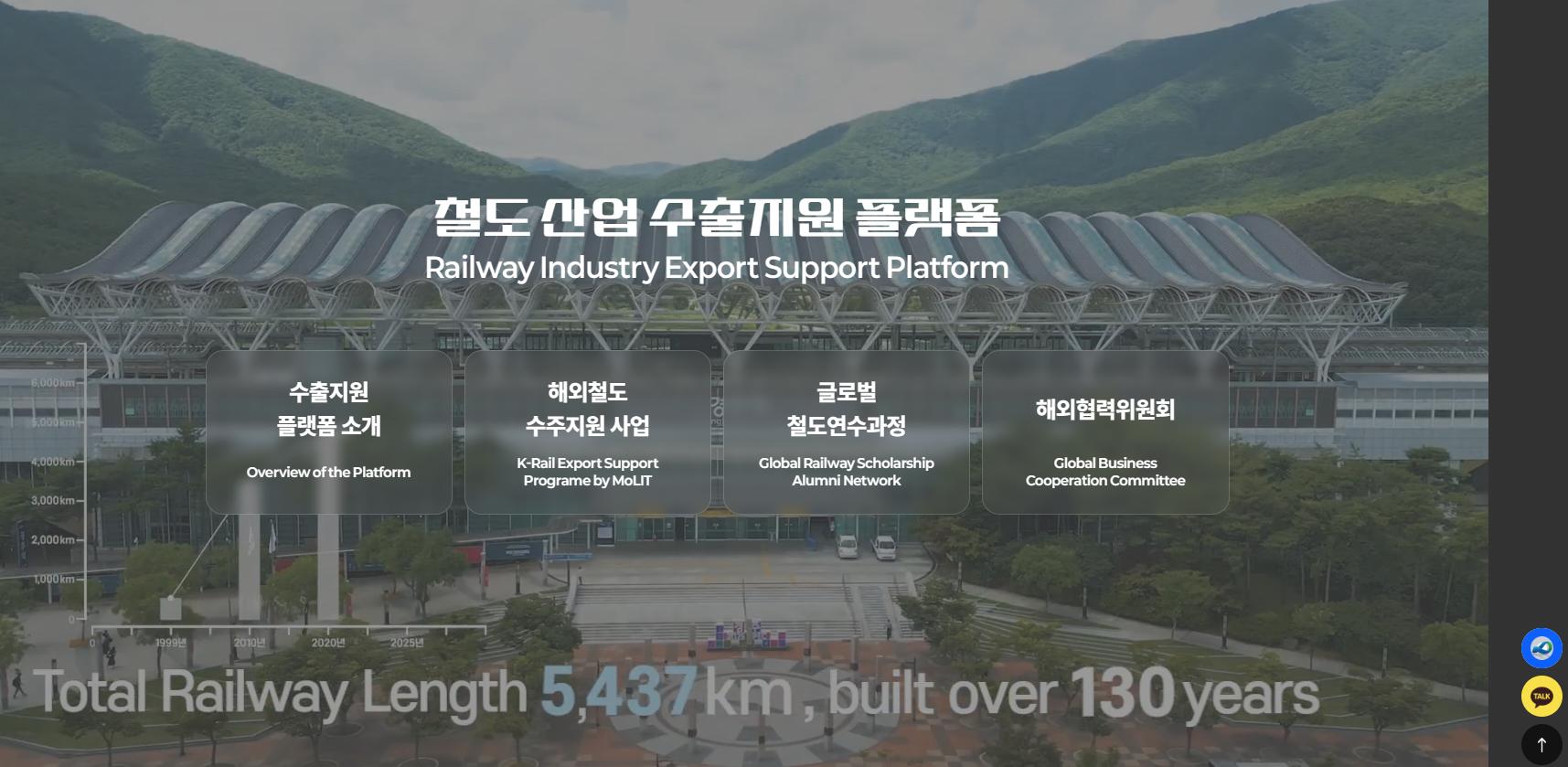 이번달 전용 웹사이트(railkorea.or.kr)를 개설하여 국내 수출기업 정보를 제공하고, 플랫폼 이용자를 대상으로 해외진출 관련 정부 지원사업 정보를 안내하고 있으며, 카카오 비즈니스 채널을 통해 전담 온라인 상담창구를 함께 운영하고 있습니다.